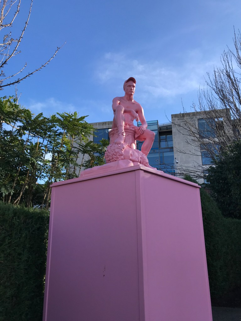 A few weekends ago I was presented with the extremely generous gift of a trip to Dublin to watch a band called ‘The High Kings’ who play traditional Irish folk songs, mixed in with some original material, and who’s music I have been slightly obsessed with for a few years.* We filled the time around the show with some sightseeing; taking a walking tour around the city and visiting Dublin Castle as well as spending a fair few hours in the local Wetherspoons. Dublin has the familiar murmur of a European capital, with towering statues with stony faces, but on a bitter but clear day we were most enamoured with its parks. We walked along criss-crossing paths and past still, cropped grass to find a reclining statue of and tribute to Oscar Wilde. In another garden, next door to Dublin Castle, we found a bright pink statue of a hero with a decapitated head at his feet. But, rather than classical dress, he was dressed in shorts, boots and a baseball cap. I couldn’t find any information on it online and there was no plaque to tell me its origin but, looking back, it was the perfect symbol of the appropriated and personalised mythologies that would occupy my thoughts in the coming weeks.