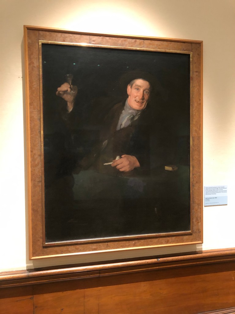 But the painting that struck me the most was not an idyllic landscape but a portrait. Emerging from a dark sea of paint, that barely hints at a room, is the bright face of Old Tom Morris, who leans on a wooden table and raises a dainty glass to us. The placard tells us that Tom Morris is a ‘local character’ who the artist, S.J. Peploe, painted multiple times. I think the term local character is brilliantly provocative– it animates the mischief and vitality that Peploe had encased in Tom’s frozen expression.